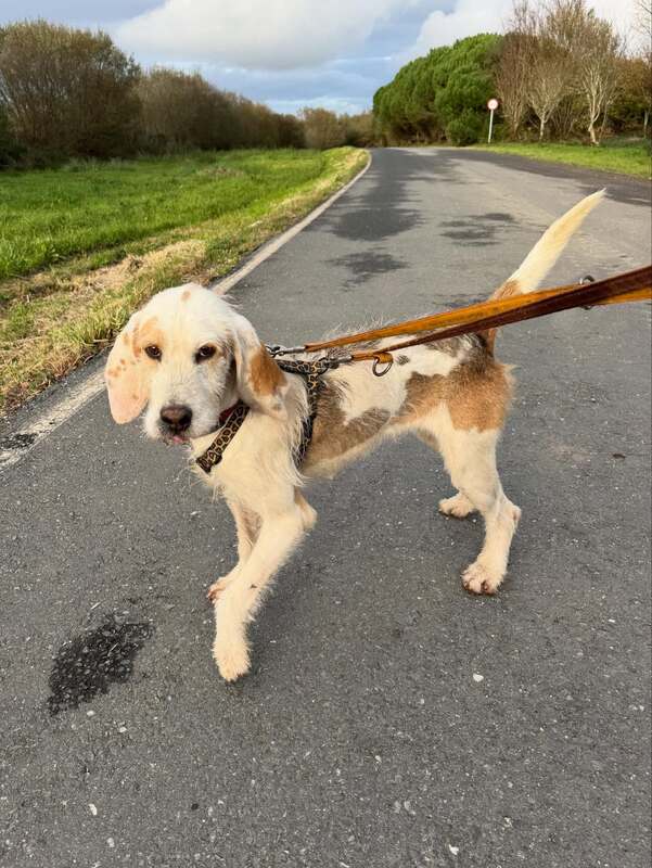 Godello is sociable with people once he trusts, he’s a bit scared of strangers. He walks a bit funny and the vet said it was a problem in his hip. He’s not in pain but he needs some weight control and once he grows older, he will probably need more relaxed walks as it can worsen with age.